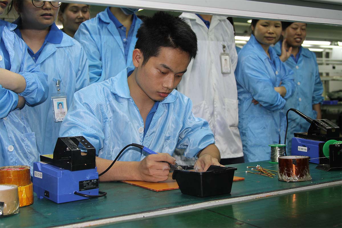 此次比赛共设有焊锡、打螺丝、贴TP、盘点物料、机器功能测试等六个项目,涵盖了大部分生产工序。