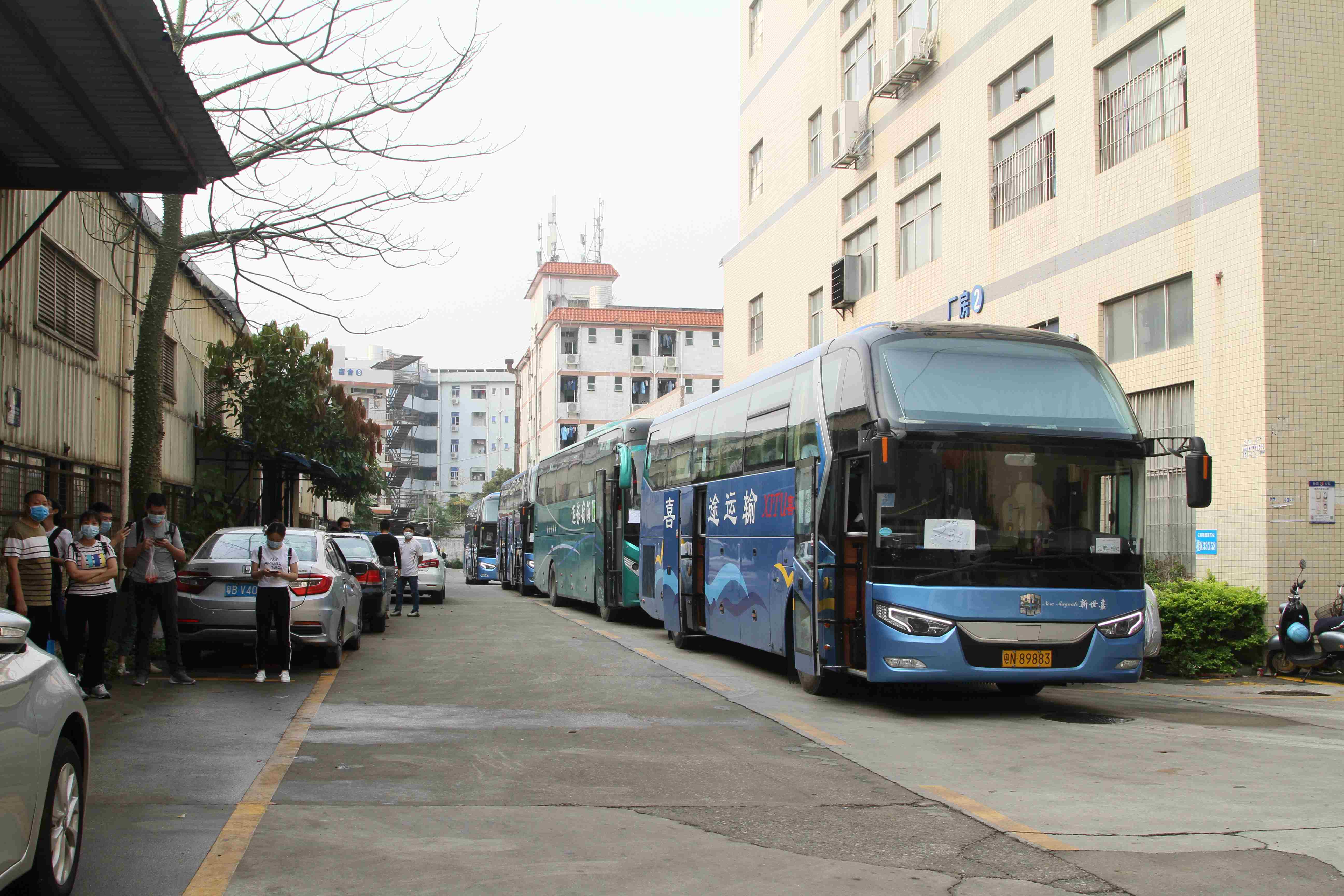 早上,四台大巴车准时停在厂门外等待大家上车。