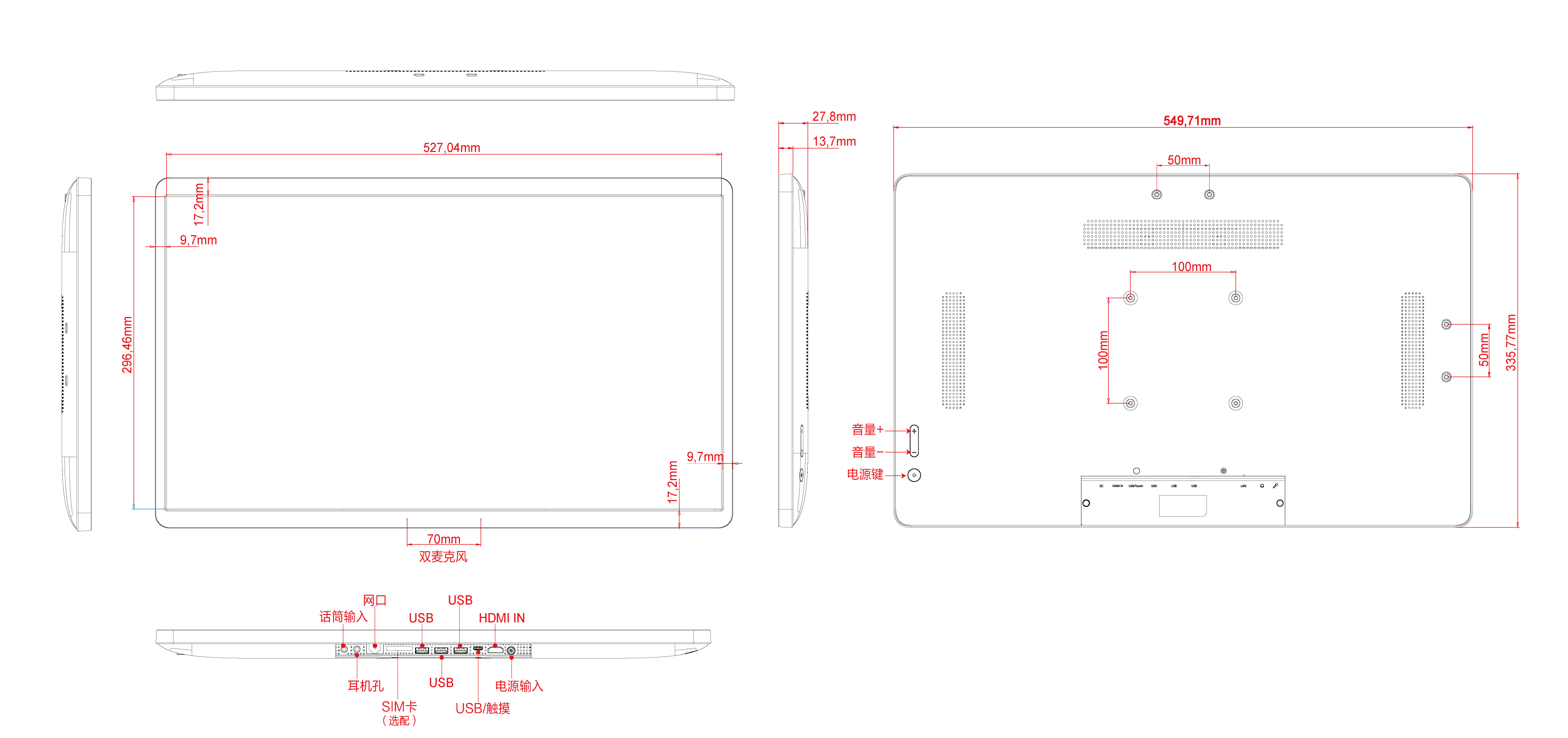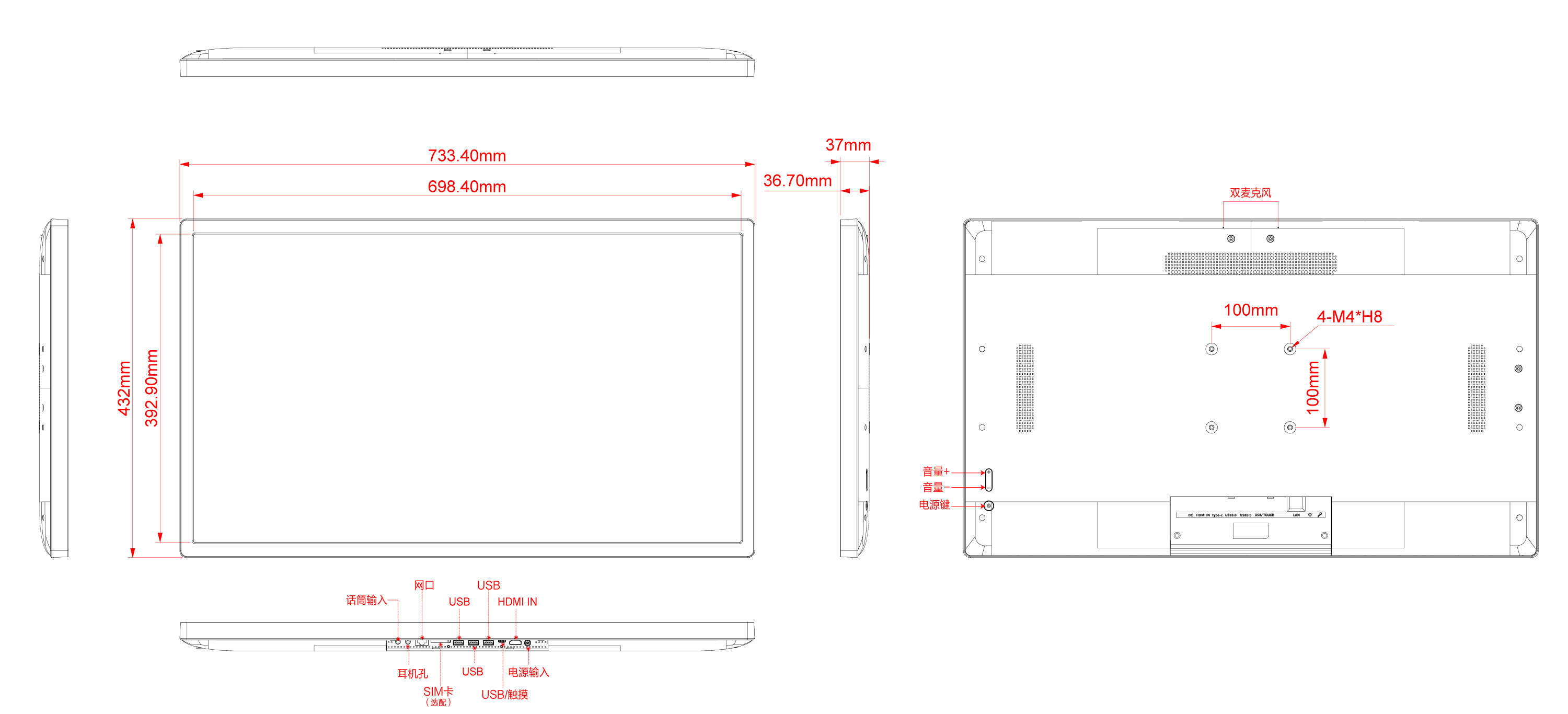 10点电容触控屏,让你直接体验超大屏打王者的快感。屏幕背壳右下方配置了音量键和电源键,下方配置双麦克风,以及丰富的接口。分别有话筒输入、耳机孔、网口、3个USB接口、type-c口、HDMI、DC电源输入。3个USB接口可以方便同时外接蓝牙遥控、摄像头、手写笔等等,扩展能力超强。亿莱顿推出了两款不同尺寸的屏幕,24"/32"。这两款除了屏幕大小不同以外,其他设计都是一样(下图分别为24寸与32寸规格图)