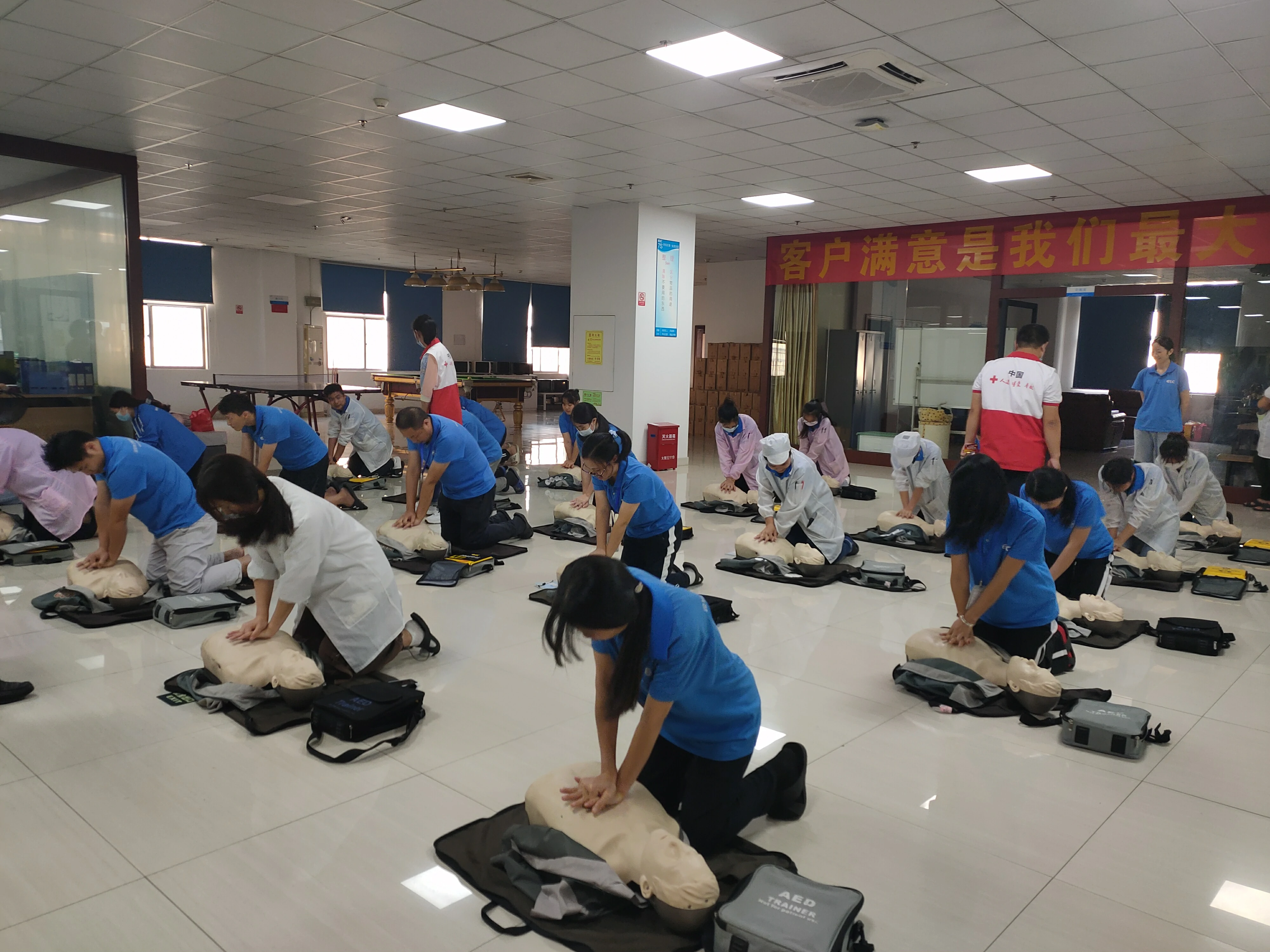 培训现场,老师向大家讲解了心肺复苏和自动体外除颤仪的使用方法、气道异物梗阻与海姆立克急救法等急救技能。大家听得非常认真,并进行了实操训练,现场气氛十分活跃。